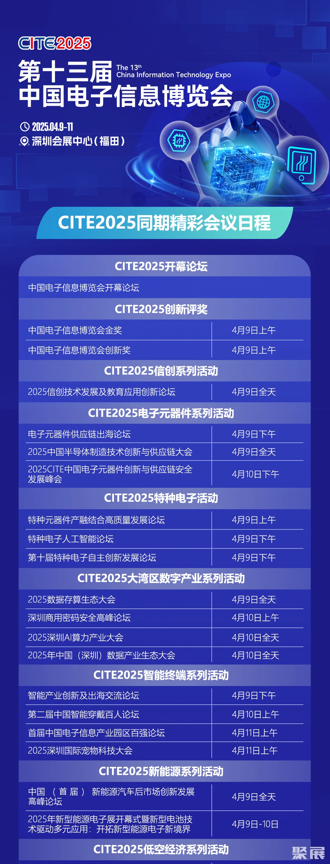 随着科技的飞速发展,电子信息产业已成为推动全球经济增长的关键力量。在这一背景下,第十三届中国电子信息 博览会(CITE2025)将于2025年4月9日至11日在深圳会展中心(福田)盛大举行。为了深入探讨电子信息领域最新趋势、技术突破与市场机遇,CITE2025同期将举办超20+场会议、论坛活动,会议涵盖智能终端、信创、大数据与存储、人工智能、新型能源、低空经济、电子元器件、特种电子元器件等热门话题,将汇聚领军企业、专家、学者等500+分享嘉宾,深入探讨和剖析电子信息产业热点话题,共话电子信息产业未来发展前沿。