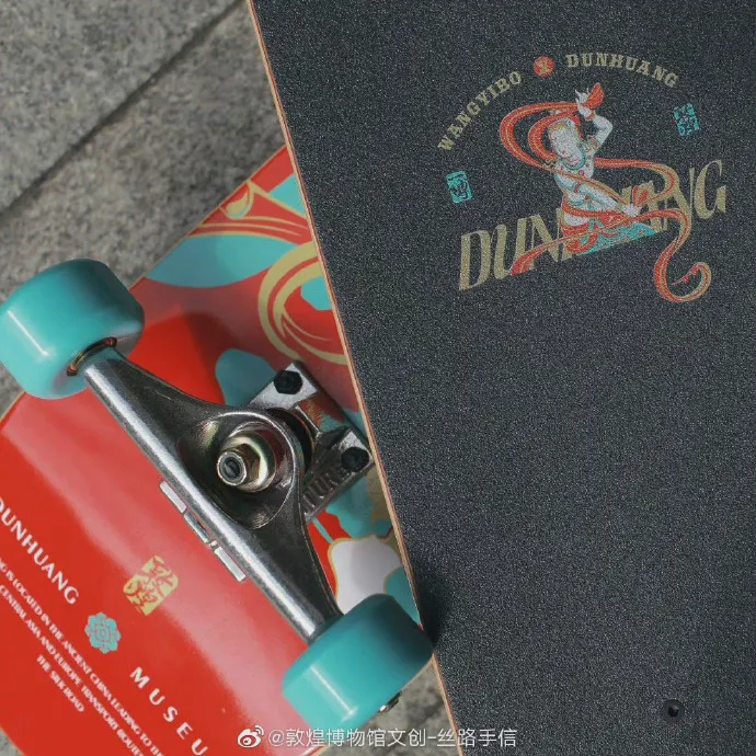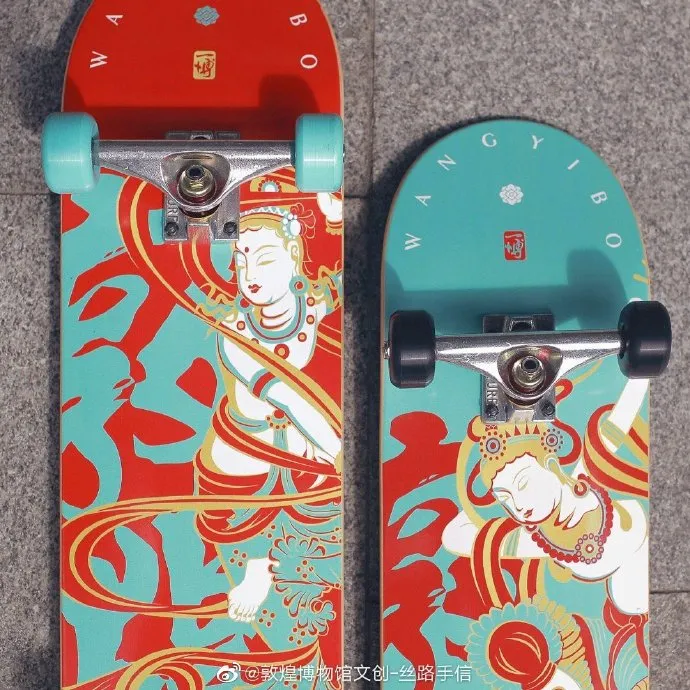 敦煌博物馆文创产品开发团队大胆创新,让敦煌艺术与世界艺术融合,跨界至潮流、时尚、运动等领域,深受年轻人喜爱。案例包括王一博专属定制滑板和综艺节目《极限挑战》中的文创产品。