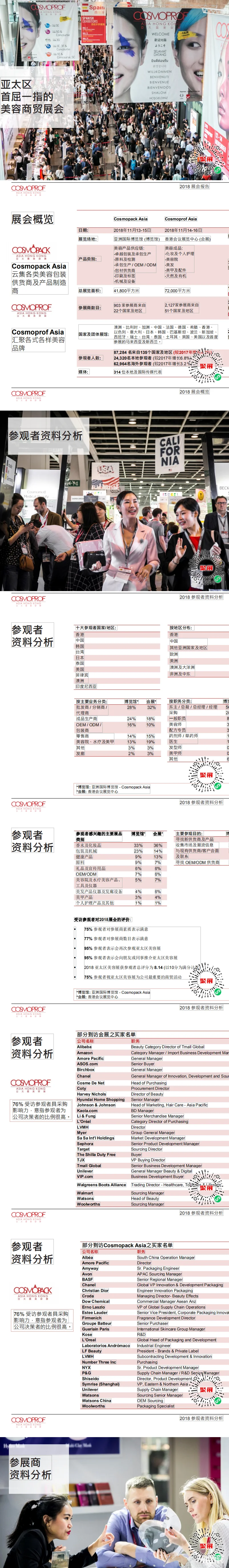 香港亚太美容化妆品包装材料展览会(Cosmopack Asia)上届展会总面积40000平方米,参展企业843家均来自中国、美国、迪拜、德国、西班牙、巴西、俄罗斯、韩国、日本等,参展人数达52000人。