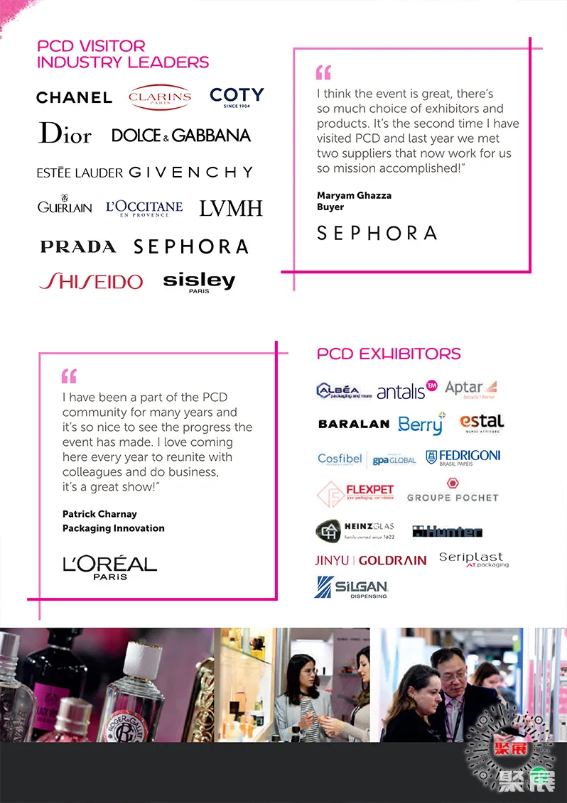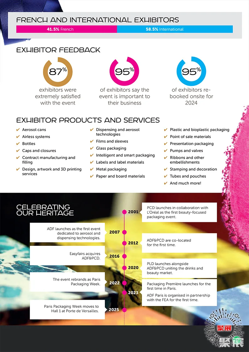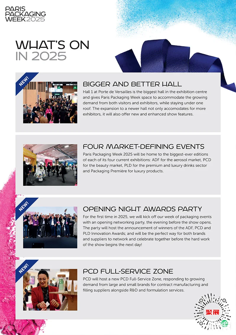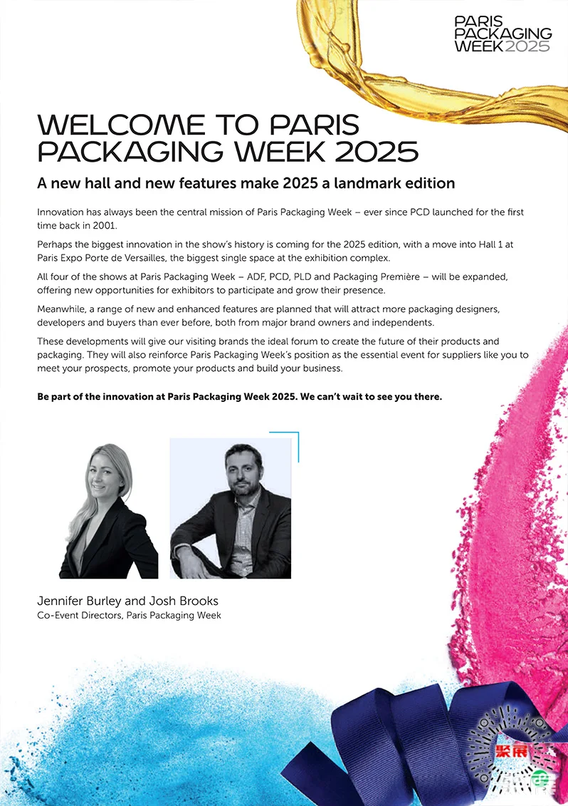 法国巴黎化妆品及香水包装、奢侈品包装展览会(Paris Packaging Week)是欧洲最大规模、最专业的化妆品及香水包装展之一。汇集了来自国际领先化妆品品牌(护肤、香水和个人护理)的专家以及业内主要包装供应商。(本文内容版权归属聚展所有,未经同意,禁止转发)