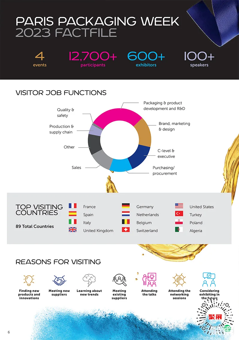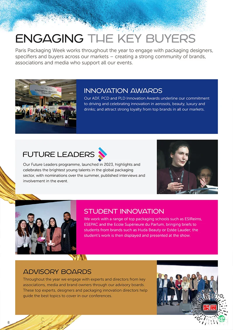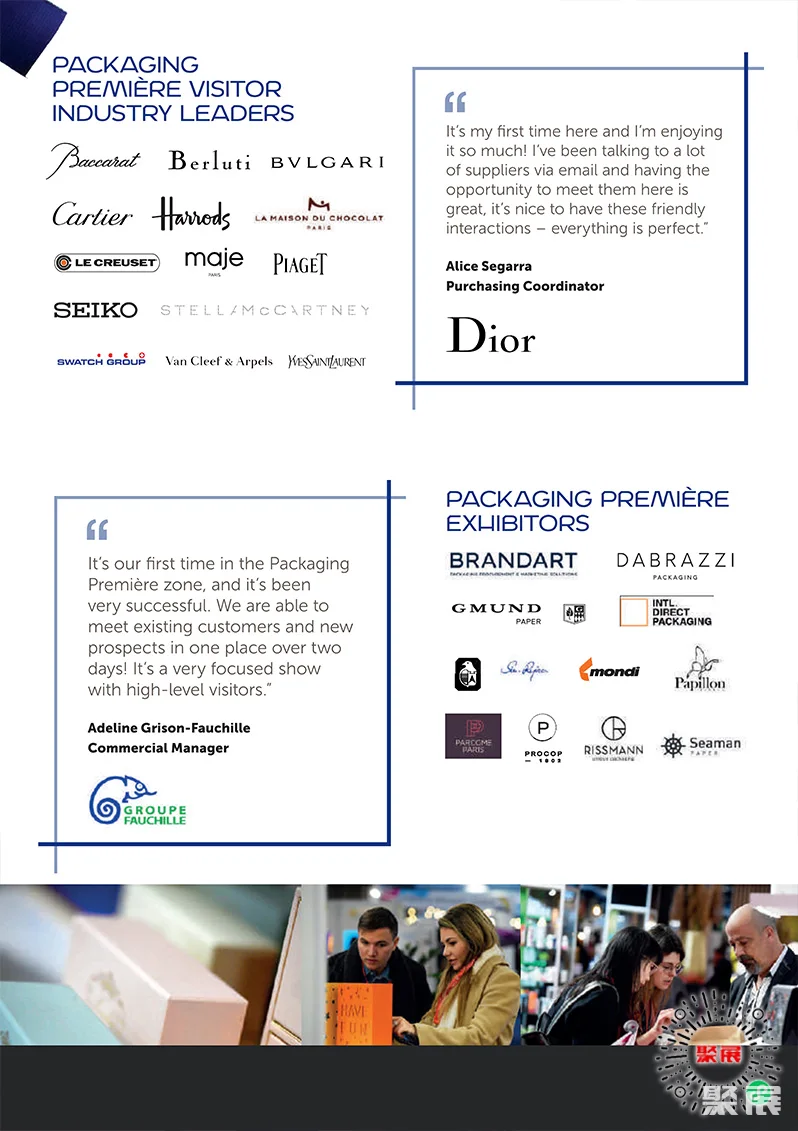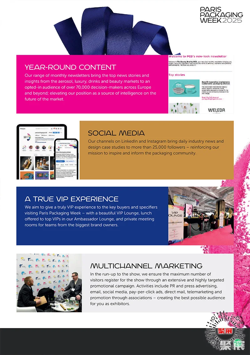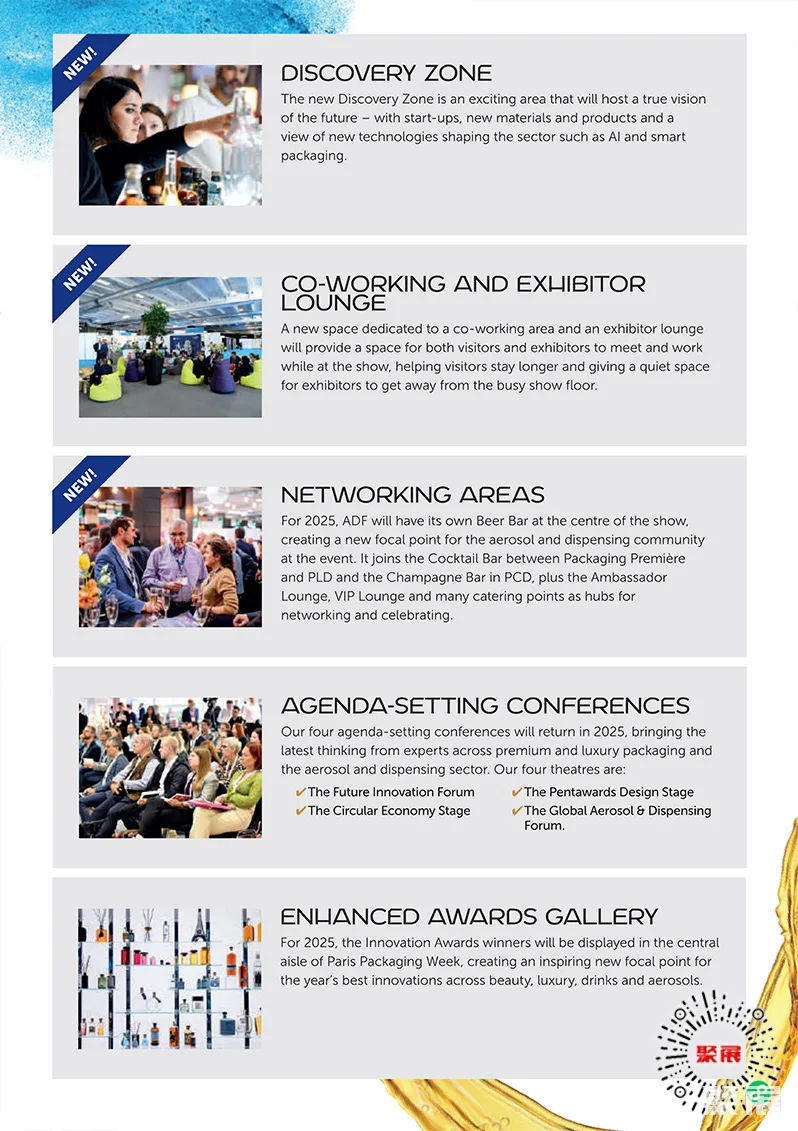 法国巴黎化妆品及香水包装、奢侈品包装展览会(Paris Packaging Week)是欧洲最大规模、最专业的化妆品及香水包装展之一。汇集了来自国际领先化妆品品牌(护肤、香水和个人护理)的专家以及业内主要包装供应商。(本文内容版权归属聚展所有,未经同意,禁止转发)
