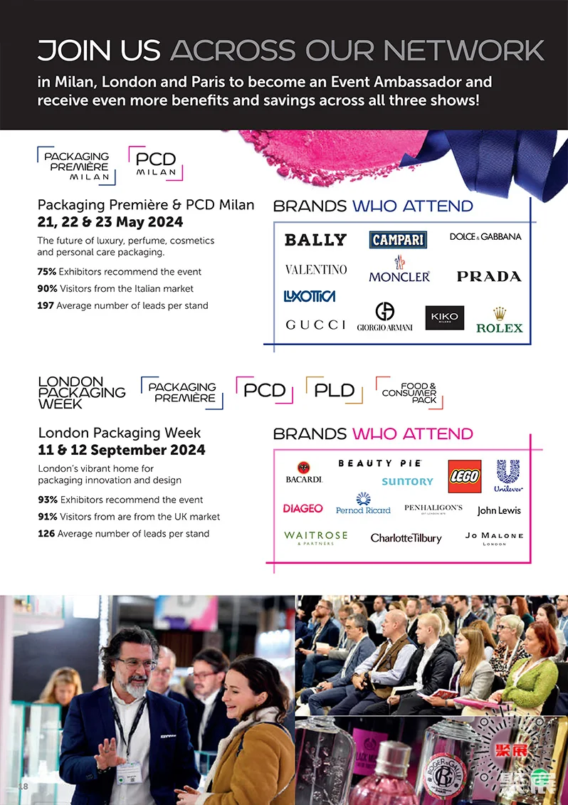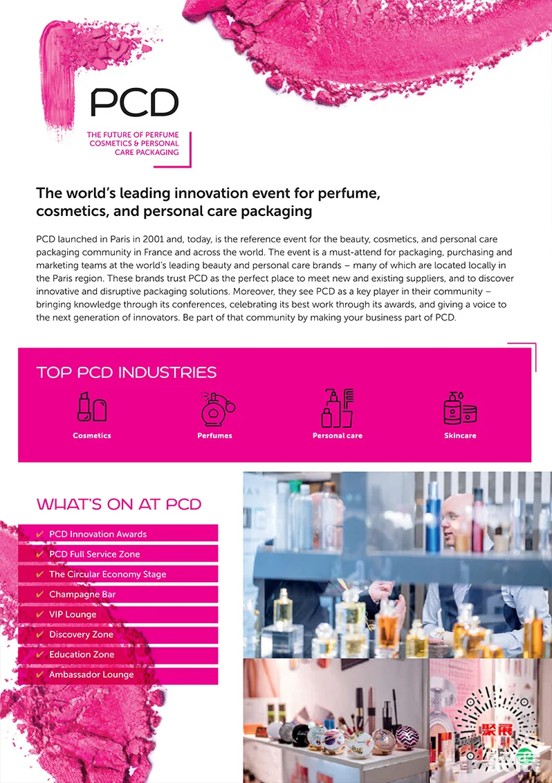 巴黎包装周是一个屡获殊荣的包装节,涵盖美容和个人护理、高级饮料、气雾剂和奢侈品。法国巴黎化妆品及香水包装、奢侈品包装展览会(Paris Packaging Week)的四个展览-ADF、PCD、PLD和Packaging premire,帮助成千上万的品牌创建他们的下一个产品发布。通过将您与最新的创新,世界上最好的供应商以及有关设计,可持续性和创新的最新专家见解联系起来。