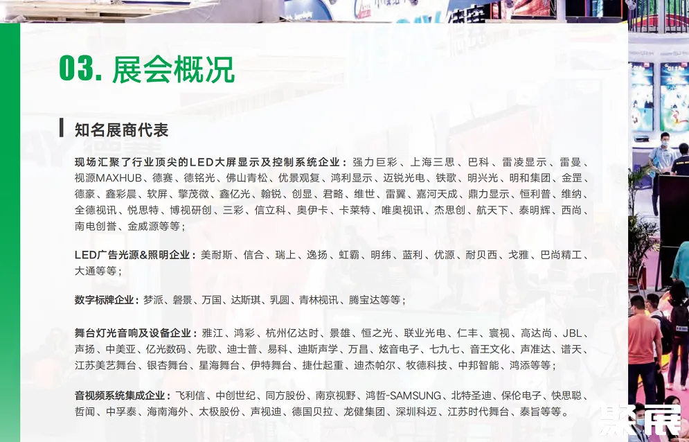 展品应用领域:广告传媒、舞台租赁、娱乐场所、文化旅游、夜游经济、商业零售、空间设计、美陈、市政工程、数字显示、广播广电、会议多媒体、医疗、安防监控等 (本文内容版权归属聚展所有,未经同意,禁止转发)