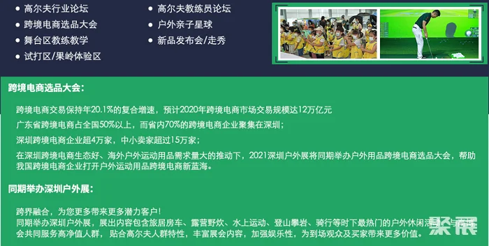 作为粤港澳大湾区核心城市和交通枢纽,深圳连接全国亦通达全球,城市的包容性强,文化产业发达,时尚产业蓬勃,人口经济发达。高尔夫作为一项户外运动,高尔夫爱好者与户外运动爱好者高度重合,我们将为商家提供接触户外运动爱好者机会,实现为户外运动展商拓展全新销售渠道,并为户外运动带来更多的潜在爱好者。