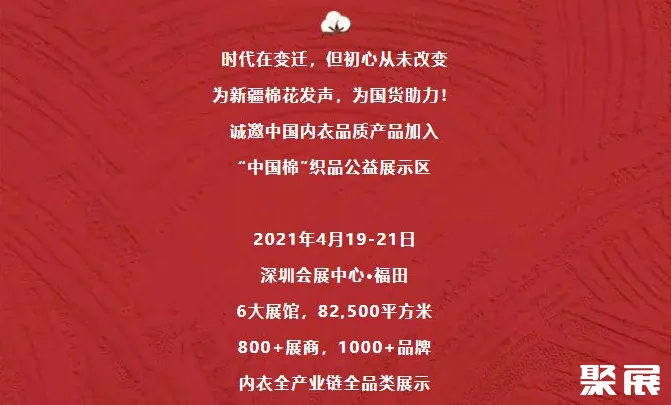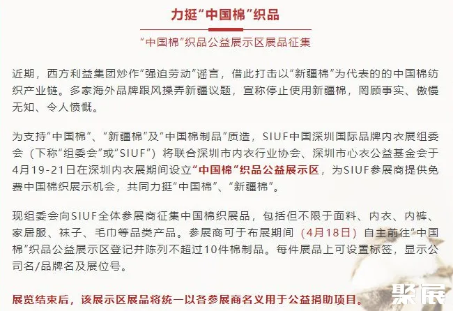 为支持新疆棉花,深圳内衣展SIUF组委会将携手深圳市内衣行业协会、深圳市心衣公益基金会于4月19-21日展会期间设立“中国棉织品公益展示区”,为参展商提供免费中国棉织展示机会,共同力挺优质新疆棉、中国棉。
