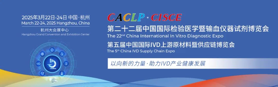 第二十二届中国国际检验医学暨输血仪器试剂博览会(CACLP)、第五届中国国际IVD上游原材料暨供应链博览会(CISCE)将于2025年3月22日至24日在杭州大会展中心隆重举行。门票预登记火热进行中~