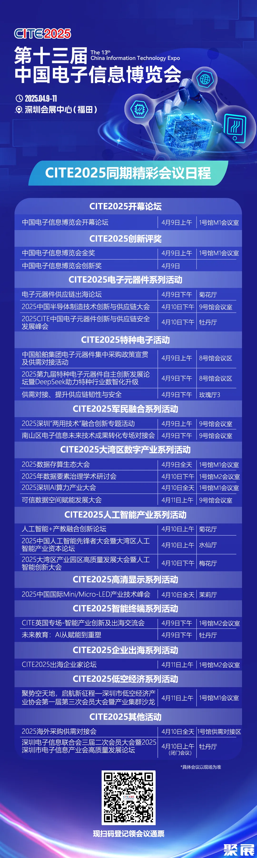 除了精彩的展览,CITE2025同期将举办2+8+N同期活动,会议主题涵盖智能终端、AI算力、数据存算、人工智能、低空经济、高清显示、电子元器件、半导体、特种电子、企业出海等热门领域话题,将汇聚中国移动、中国信通院、腾讯云、华为昇腾、华为数据存储、西部数据、希捷科技、西数存储、曙光存储、天马微、TCL华星、京东方、龙腾光电、艾比森、雷曼光电、中国船舶集团、大象机器人、清华大学、中科院软件研究所等领军企业、专家、学者等500+分享嘉宾,深入探讨和剖析行业热点话题、痛点及技术创新,共话电子信息产业未来发展前沿。具体会议日程如下所示: