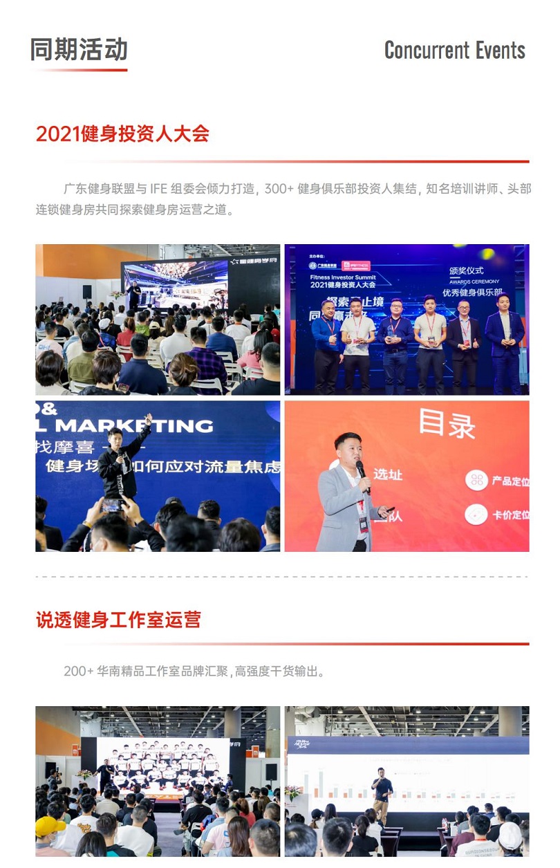 立足大湾区,辐射福建、广西及沿海等重要省份及地区,深挖华南健身全产业链的关系网络,精细买家品类,引入海量优质商机,促成品牌宣传及贸易成交。展期以外,广州国际健身展-华南私教节(IFE)将贯穿全年举办线上线下的各项对接会、交流会、培训会,包括但不限于买家对接会、IFE精英论坛、跟着偶像一起练-社区活动等,借助大数据技术手段,实现线上线下的精准引流及转化。