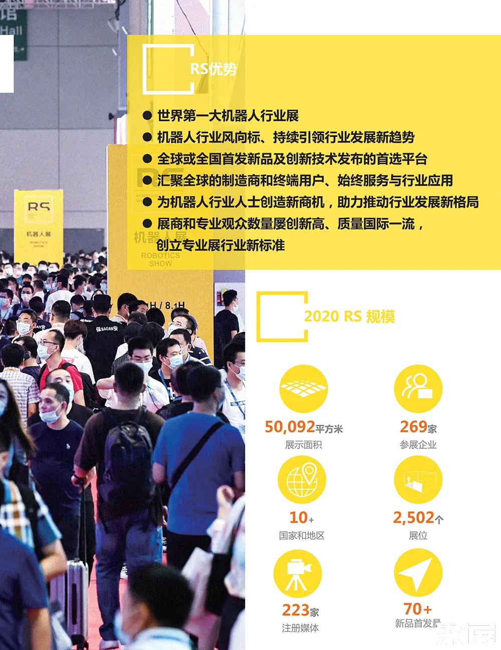 上海国际机器人展览会(RS)汇聚全球的制造商和终端用户、始终服务于行业应用,展商和专业观众数量屡创新高、质量国际一流,创立专业展行业新标准;是全球或全国新品首发及创新技术发布的首选平台,已被誉为世界第一大机器人行业展。