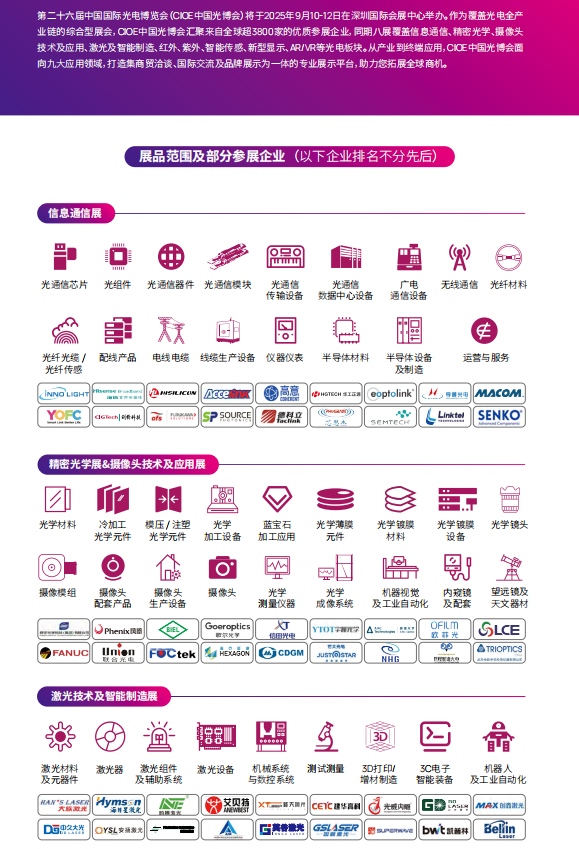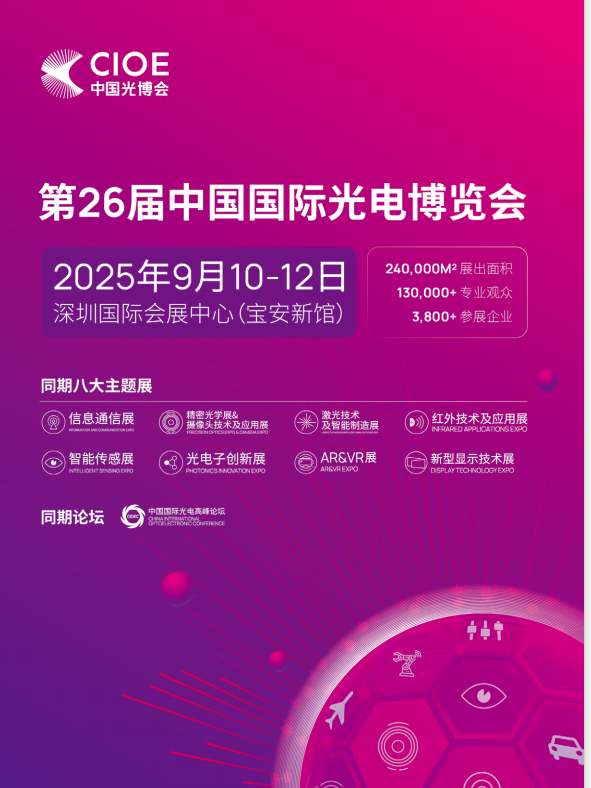 中国国际光电博览会-深圳光博会(CIOE)作为覆盖光电全产业链的综合型展会。CIOE中国光博会汇聚了来自全球超30个国家和地区的超3710家的优质参展企业,八大主题展覆盖信息通信、精密光学、摄像头技术及应用、激光及智能制造、红外、紫外、智能传感、新型显示、AR&VR、光电子创新等板块。
