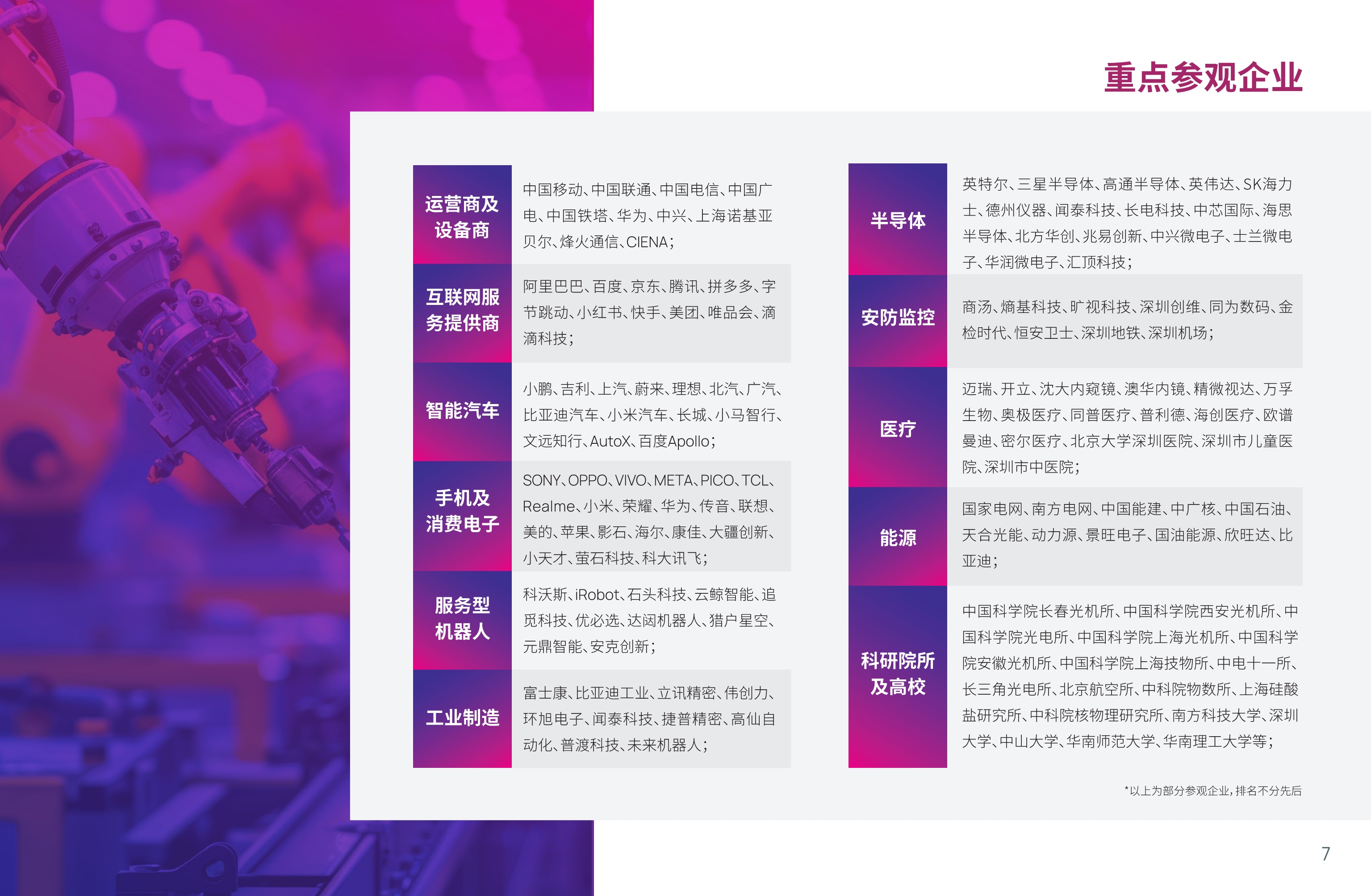 精密光学展&摄像头技术及应用展区:光学材料、冷加工光学元件、模压/注塑光学元件、光学设备(车、刨、铣、磨)、蓝宝石加工应用、光学薄膜元件、光学镀膜材料、光学镀膜设备、光学镜头、摄像模组、镜头配套产品、摄像头生产设备、光学测量仪器、光学成像系统、机器视觉及工业自动化、AR&VR、摄像头、内窥镜及配套