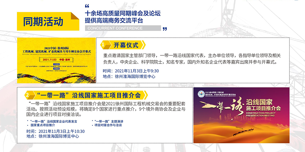 徐州国际工程机械展览会(CHINA XUZHOU)中国最大规模工程机械展之一。本届展会整体规模扩大至100000㎡,6大展馆、11大主题。预计逾1000家优质企业参展,150000+专业观众观展。致力于铸造工程机械行业集展示、交易、合作、交流为一体的世界一流展览平台。