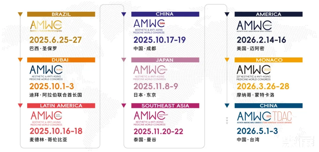 AMWC(Aesthetic & Anti-aging Medicine World Congress)于2003年创立,是汇聚全球医美专家、推动行业创新的国际平台。凭借卓越的学术引领和行业规范能力,其影响力已扩展至摩纳哥、北美、中国、巴西、哥伦比亚、日本、泰国等全球多个国家和地区。