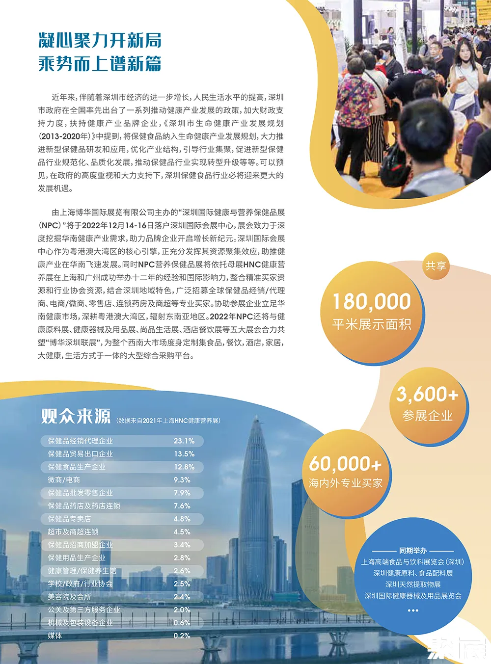深圳国际健康与营养保健品展览会(HNC)华南区首屈一指的大健康产业展,HNC品牌在营养健康领域拥有国际化影响力。以华南区最大的中成药市场为枢纽,辐射粤港澳大湾区,面向东南亚,一路延伸到中亚及一带一路国家的采购资源。