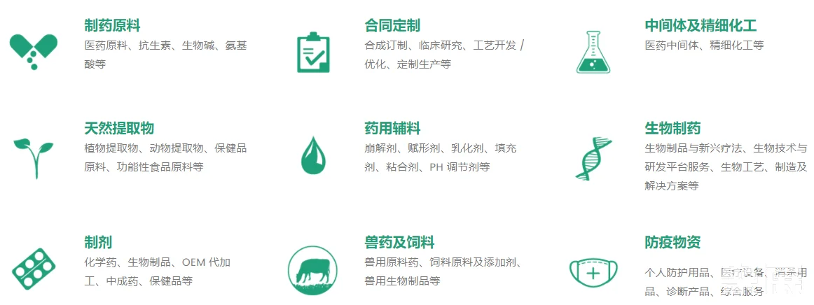 展会发展至今,已涵盖了制药全产业链相关的15大细分板块。展品囊括制药原料、中间体及精细化工、药用辅料、制剂、合同定制、生物制药、天然提取物、制药机械、包装材料、实验室仪器、环保与洁净等领域,为制药企业优化产业链布局、加速转型创新构建了海内外深度参与的双向平台。