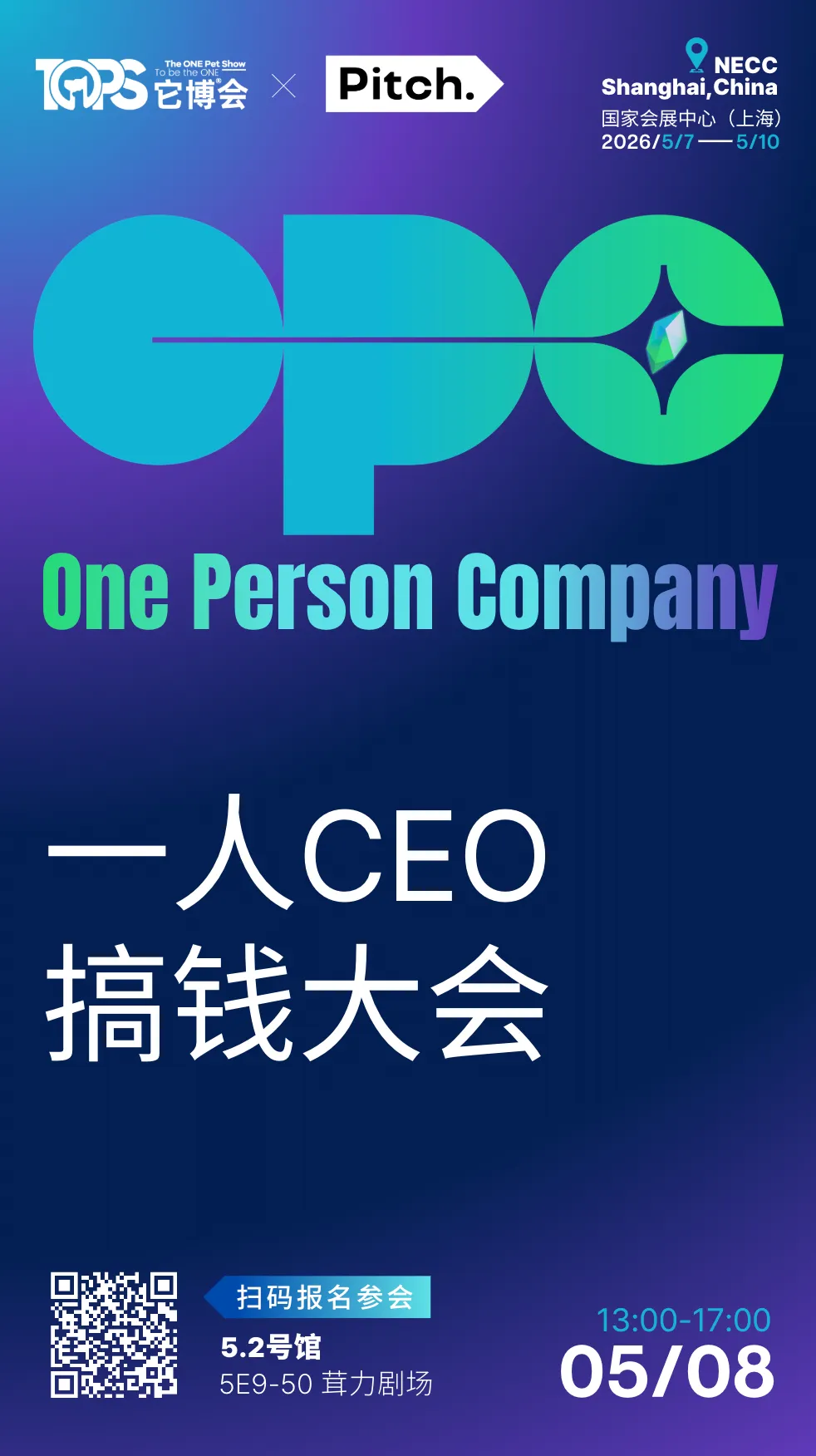 同时,围绕最热的AI人工智能和OPC一人CEO话题,本届TOPS它博会也携手了更多生态伙伴带来创新内容,将于展会期间和“WAIC人工智能大会”合作“2026AI人工智能宠业生态大会”(5月7日)以及和国内领先的OPC会员制社区Pitch.合作“OPC一人CEO搞钱大会”(5月8日),聚焦AI时代超级个体如何创造极致价值?