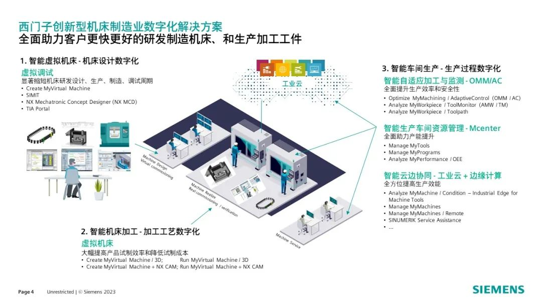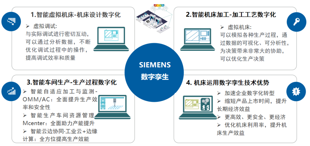 例如,在产品研发阶段,西门子One数控系统能够助力机床制造商缩短机床设计时间和现场调试时间,提升机床研发、上市效率。面向机床用户,西门子One数控系统的机床虚拟加工解决方案可实现对加工工艺、加工速度、加速度、节拍时间等方面的仿真验证,帮助客户大幅缩减试切时间和试切成本,并规避碰撞风险。目前,一些大型机床企业已经开始试用西门子One的虚拟调试系统,实现了从840Dsl到One的移植和机床调试。