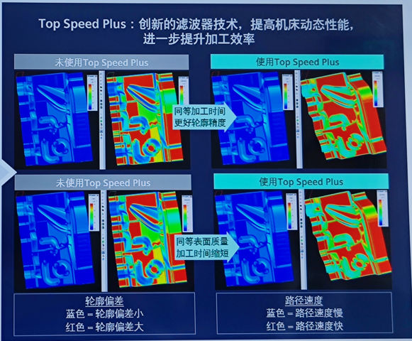 (2)智优曲面iSurfine。数控系统根据零件整体轨迹对加工速度进行全局规划自动平滑,实现高速、高效基础上的高表面质量加工。优化后刀具轨迹清晰一致,加工零件表面均匀无过切、欠切纹路。
