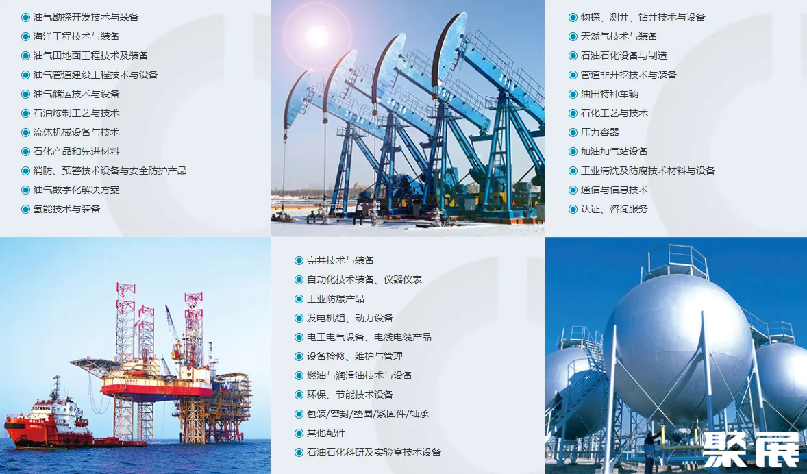 油气勘探、开发与生产装备;物探、测井、钻井技术与设备-陆上/海上;油气田地面技术设备;石油石化设备与制造;自动化技术装备、仪器仪表;DCS、PLC控制系统和现场总线;油气管道建设工程技术和设备;发电机组等动力机械设备;油田特种车辆;工业防爆产品;电工电气设备、电线电缆产品;石油石化科研及实验室技术设备;石油炼制工艺与技术;石化工艺与技术;设备检修、维护与管理;流体机械设备与技术;燃油与润滑油技术与设备;销售系统及设施;石化产品和先进材料;环保、节能与安全管理;消防报警设备、工业安全及劳保用品;工业清洗及防腐技术材料与设备;卸装与包装技术;通讯及信息系统管理、电子商务 (本文内容版权归属聚展所有,未经同意,禁止转发)