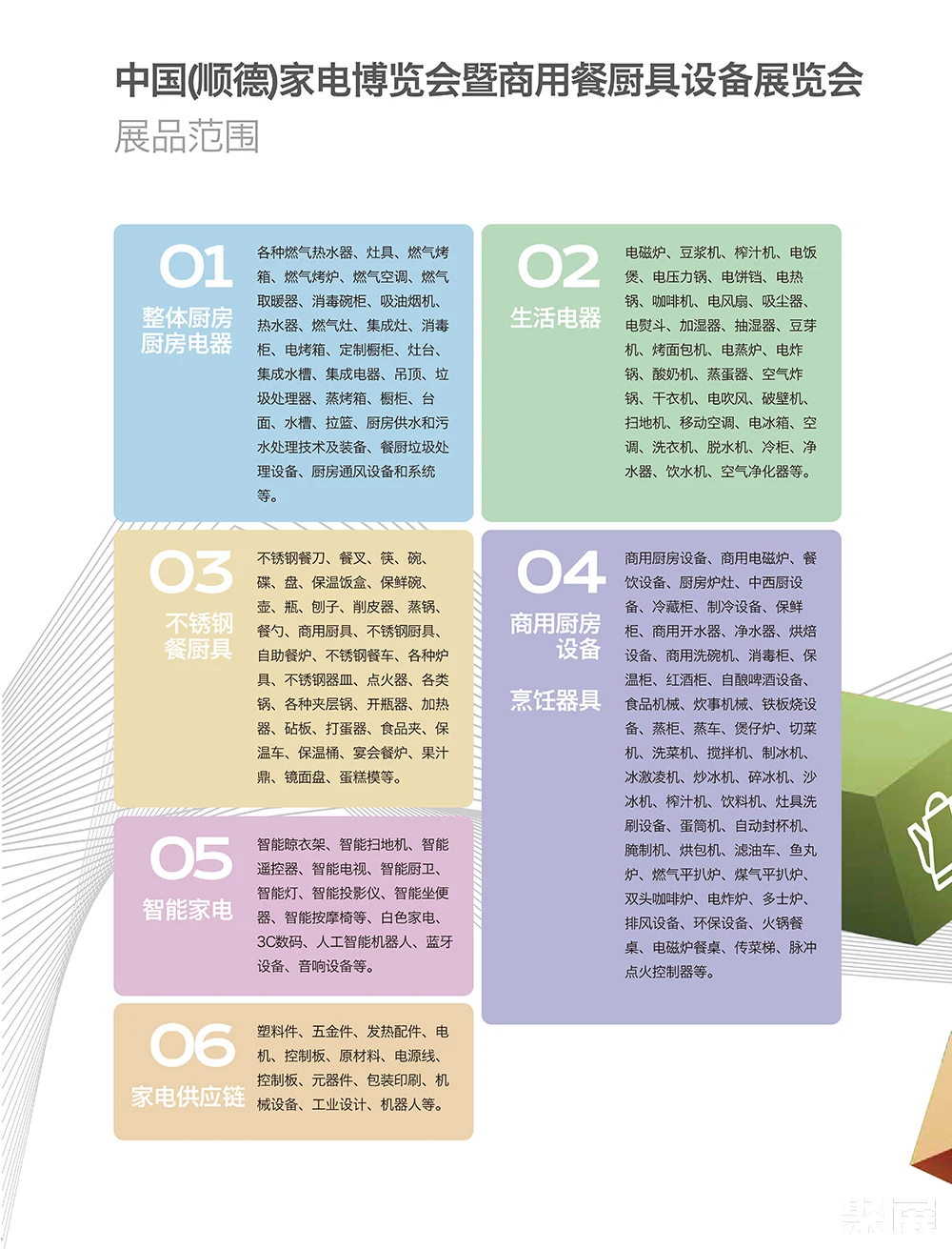整体厨房/厨房电器:各种燃气热水器、灶具、燃气烤箱、燃气烤炉、燃气空调、燃气取暖器、消毒碗柜、吸油烟机、热水器、燃气灶、集成灶、消毒柜、电烤箱、定制橱柜、灶台、集成水槽、集成电器、吊顶、垃圾处理器、蒸烤箱、橱柜、台面、水槽、拉篮、厨房供水和污水处理技术及装备、餐厨垃圾处理设备、厨房通风设备和系统等(本文内容版权归属聚展所有,未经同意,禁止转发)