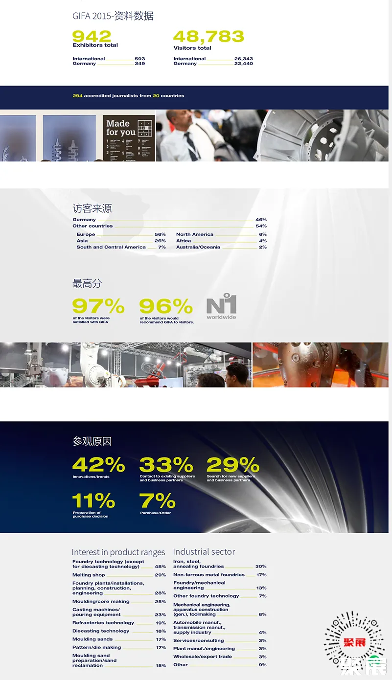 德国杜塞尔多夫铸造展GIFA上届展会总面积67000平方米,参展企业1042家均来自中国、印度、马来西亚、印尼、英国、法国、俄罗斯、西班牙、澳大利亚、土耳其等,参展人数达58783人。