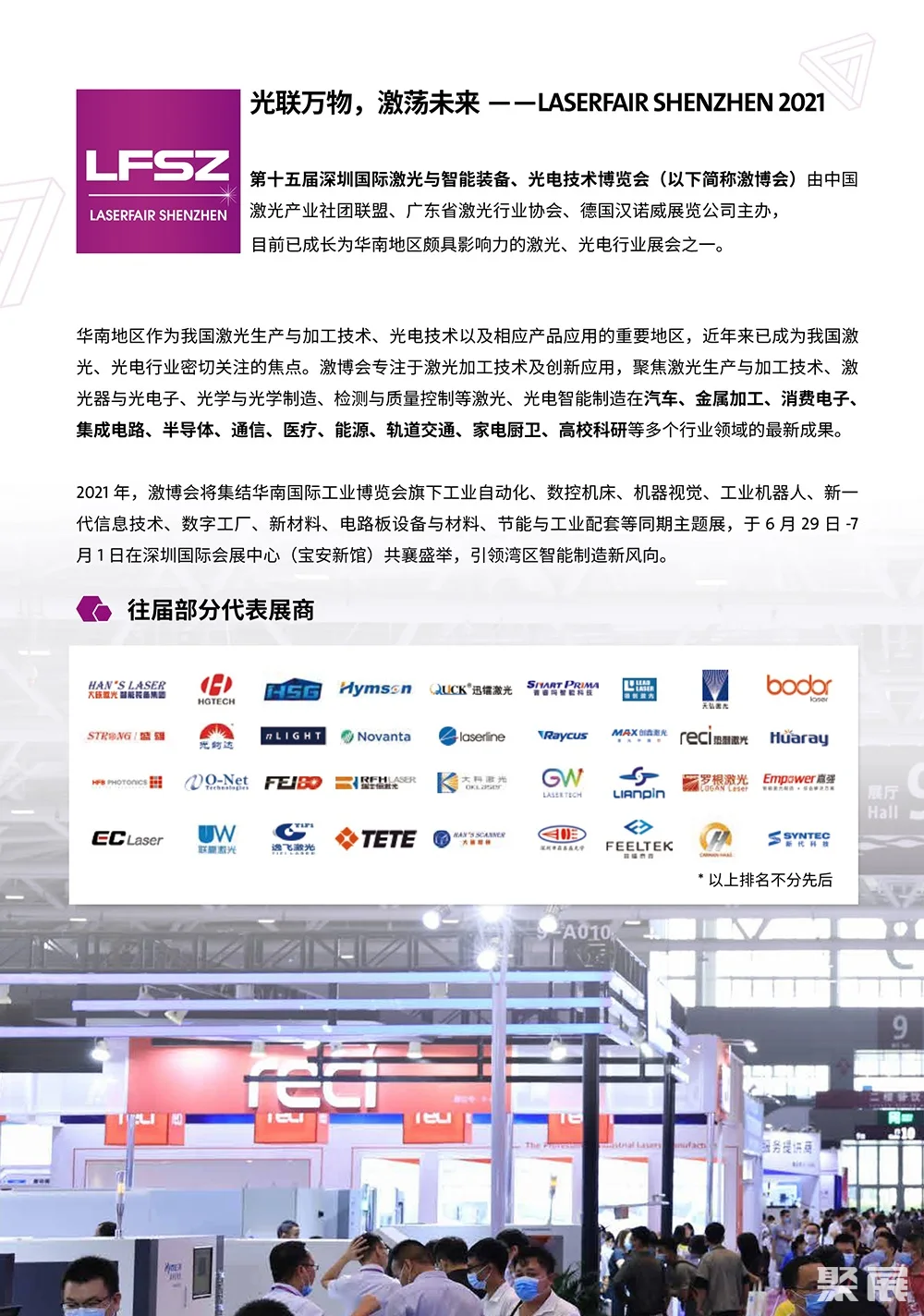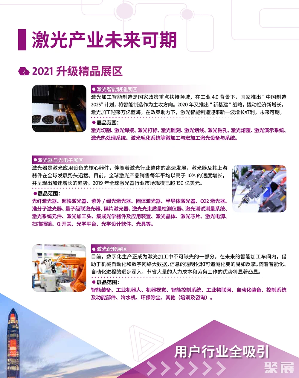 深圳国际激光技术展览会(LASERFAIR SHENZHEN)立足华南、辐射全国,致力于进一步推动华南智能装备制造业的技术升级与应用推广。搭建商贸采购、展示、技术及学术交流于一体的整体平台。(本文内容版权归属聚展所有,未经同意,禁止转发)