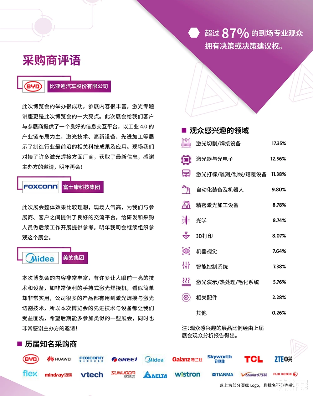 激光器与光学材料及元器件 : 新型激光器、光纤激光器、超快激光器、紫外/ 绿光激光器、固体激光器、半导体激光器、CO2 激光器、准分子激光器、量子级联激光器、碟片激光器、激光光束质量检测仪器、激光测试测量系统、激光系统元件、激光加工头、集成光学器件及应用装置、 激光晶体、激光芯片、激光电源、扫描振镜、Q 开关、光学平台、光学设计软件、光具等;激光其他应用 : 医疗应用、舞美景观应用、军民融合(本文内容版权归属聚展所有,未经同意,禁止转发)