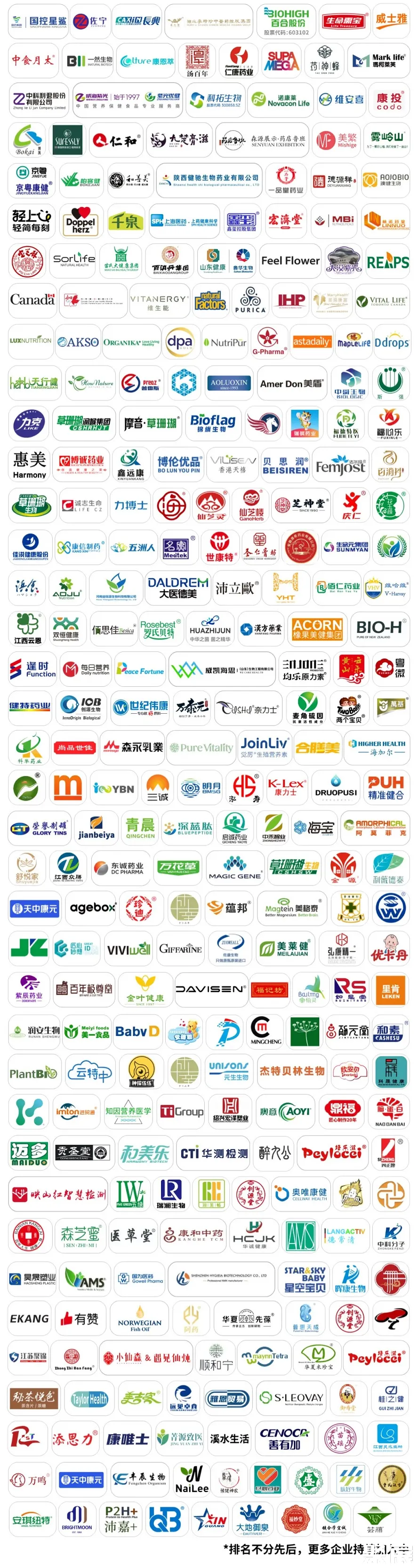 国药大健康、华润圣海、紫光、柏维力、百消丹集团、长兴生物、善元堂、新西兰美大、上药健康、k-max、逢时集团、森下仁丹、Doppelherz、同仁堂健康、威士雅、一然生物、科拓生物、澳乐维他、上海药神蜂生物、江苏护佑健康、新西兰环球制药、Fancl、瑞普斯、健莱乐、澳乐乳、诺维信、Noromega、纽派、TMR、北京同仁堂、人福医药、华海药业、新华制药、红日药业、瑞阳制药、悦康药业、振东健康、超亚医药、齐鲁制药、华联药机