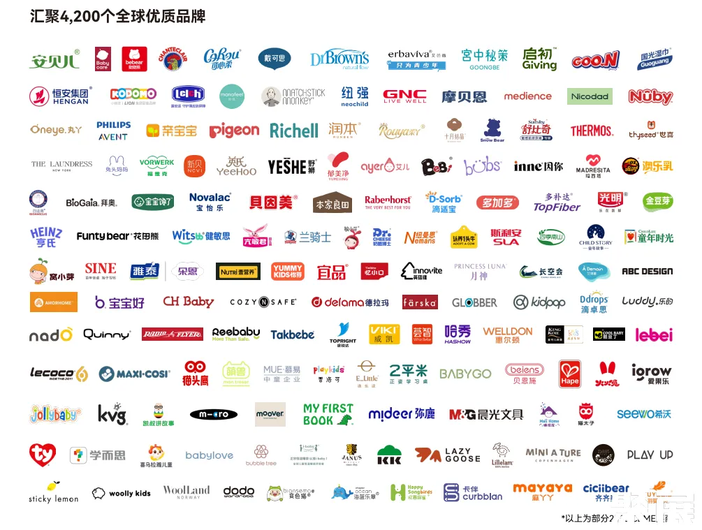 - 孕婴童食品与营养品:贝因美、GNC健安喜、光明乳业、ChildLife、英珞维、WHC、百合股份、奥拉营养、壹营养、亢敏君、健敏思、滴卓思、澳特力、比威亚、Inne、拜奥、艾儿、莱萃诺、善诺贝儿、贝欧宝、壹营养、生和堂、奥莉有机Only Organic、摩芳、艾托