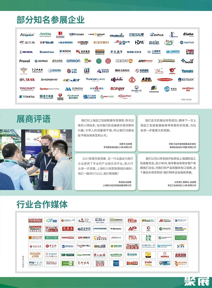 在今年的展会上,来自意大利、德国、北美、日本等多个海外展团,以及包括AZO、RONCHI、FURUKAWA、安立、堡盟、百越达、大森、朗诺、永创通达、汇拓、辰星、阀科、广田、海川、精威、沃肯、中衡、华联机械、天宇伟业、克力泰、新莱、梅特勒托利多、耐驰、欧姆龙、科迈达、大库、芙技、欧朔、石田、松川远亿、小松、斯托派克、金鼎等在内的优质海内外企业将齐聚上海,打造一场覆盖包装机械、食品加工机械、包装材料与制品、标签及软包装、物流包装、包装设计及服务、工业自动化及智能装备等加工包装全场景的行业盛会。